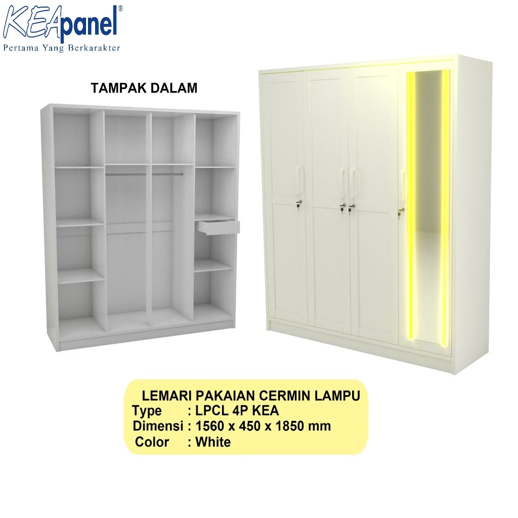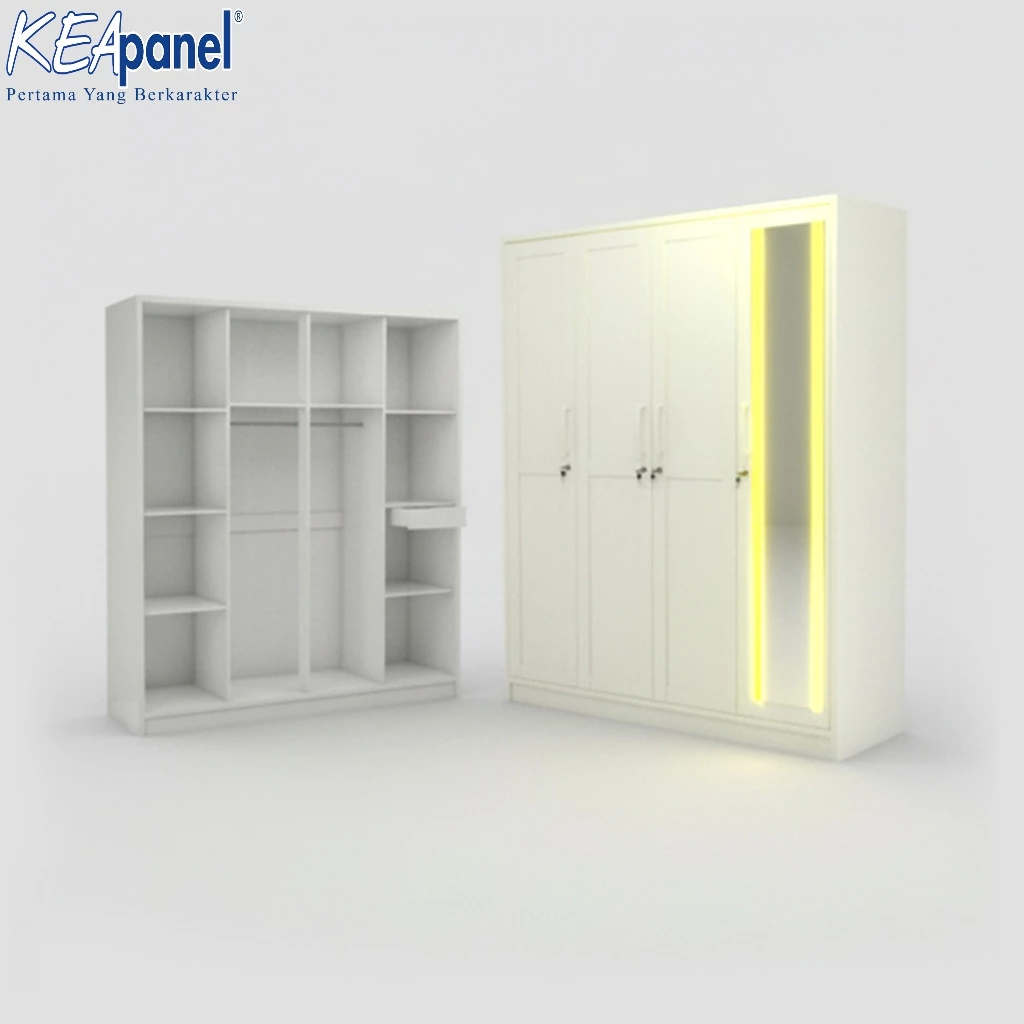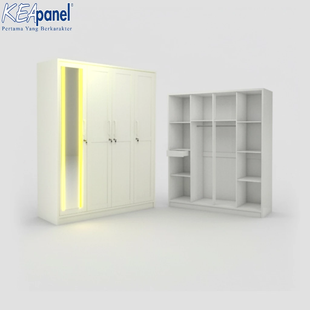 Kea Panel – Lemari Pakaian 4 Pintu Cermin Lampu – Desain Elegan & Modern Minimalis