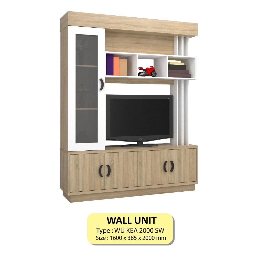Lengkapi ruang tamu atau ruang keluarga anda dengan Wall Unit TV dari Kea Panel. Desain modern minimalis dengan kombinasi warna Sonoma White (SW) menciptakan kesan hangat dan elegan. Dilengkapi rak terbuka, kabinet bawah yang luas, serta kaca display di sisi kiri – ideal untuk menyimpan dekorasi, buku, hingga perangkat elektronik rumah.